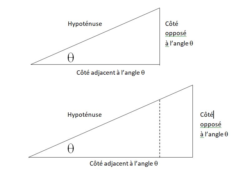 Pour un triangle rectangle, quelle que soit la dimension du triangle, le rapport entre les différents côtés est toujours égal pour un même angle.